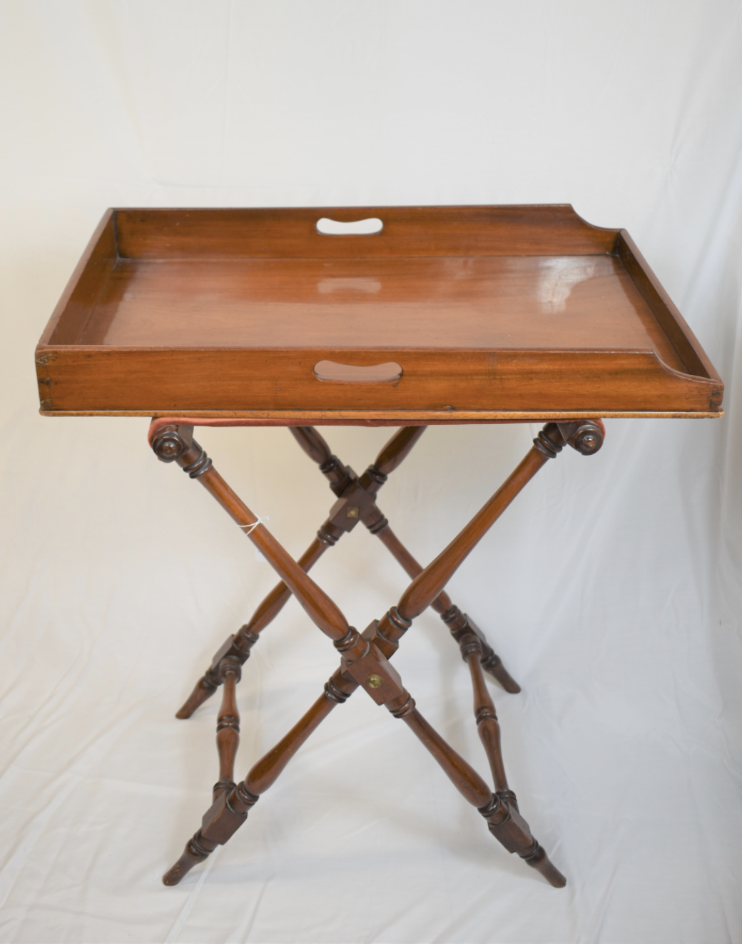 The design of the butler’s tray keeps function at its forefront. Common features of the first iterations of similar trays include detachable legs that are collapsible but extend out into an X shape. One edge of the tabletop is lower than the other three to aid in easier serving. These features can be seen in the Lougheeds’ butler’s tray. Their tray is made from mahogany and has velvet affixed to the legs to support and protect the tray top. During the 20th century, the “butler’s tray” morphed into a single stationary piece of furniture as the focus became more about the aesthetic rather than the original functionality. Its silhouette can be seen replicated in modern stores to this day.